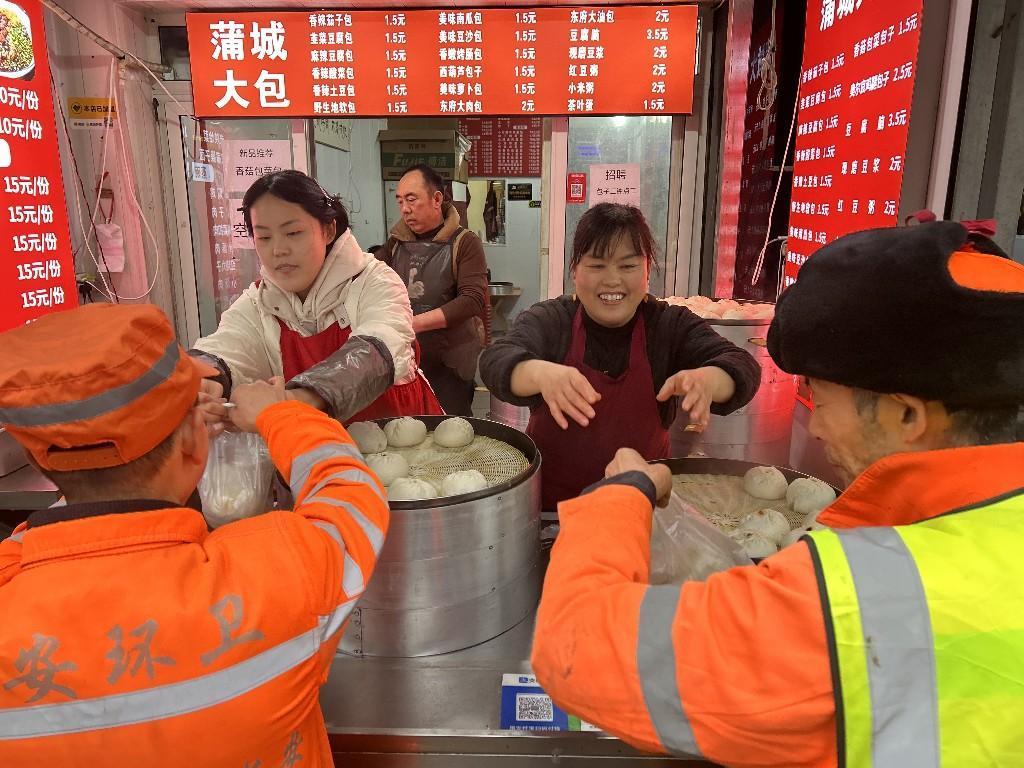 環衛工人說:“冬天早上冷,喝上一碗粥,吃上兩個包子,很暖和。”