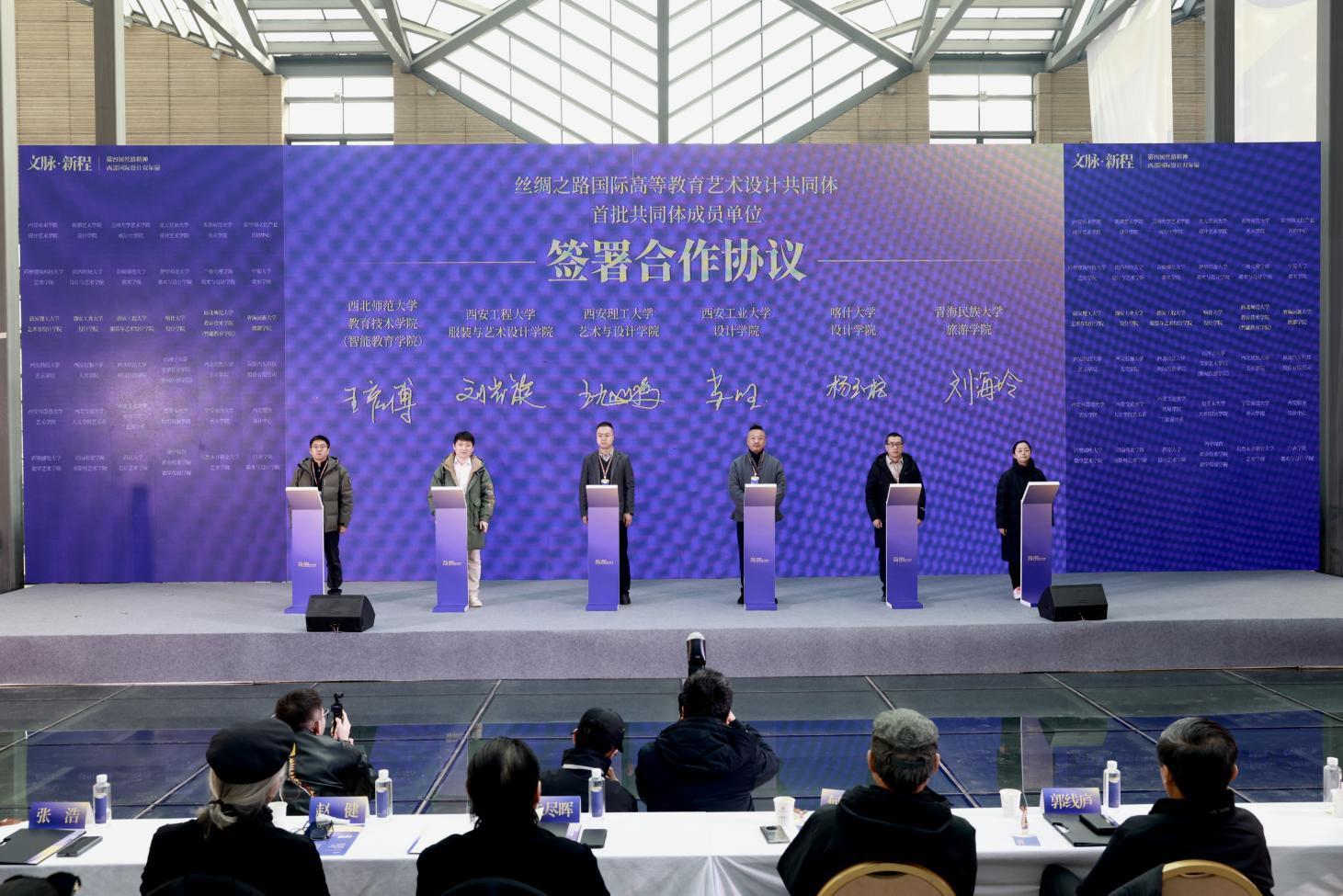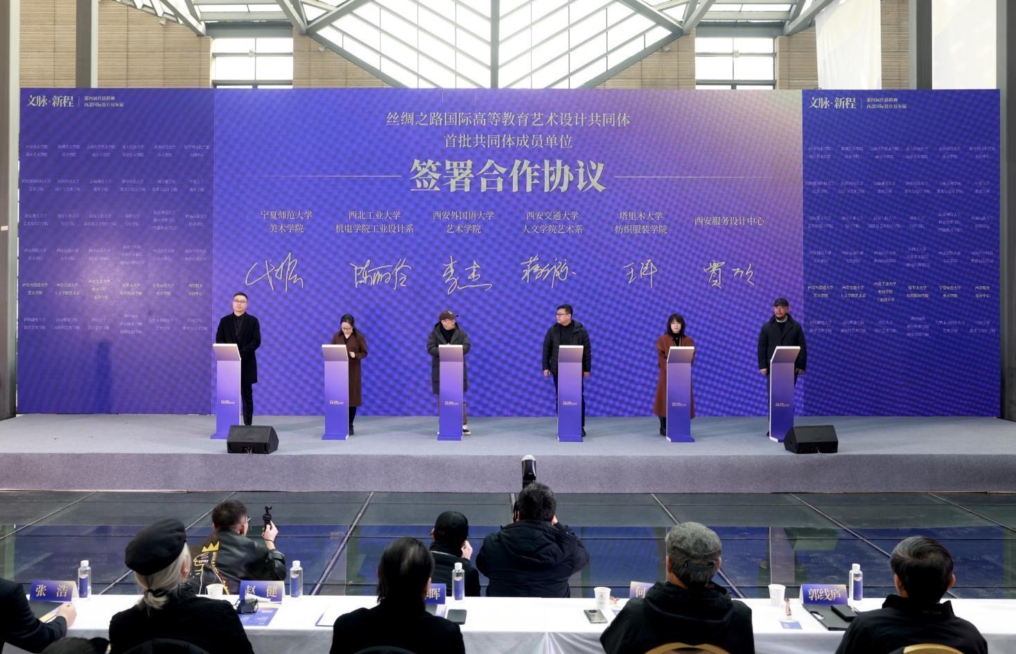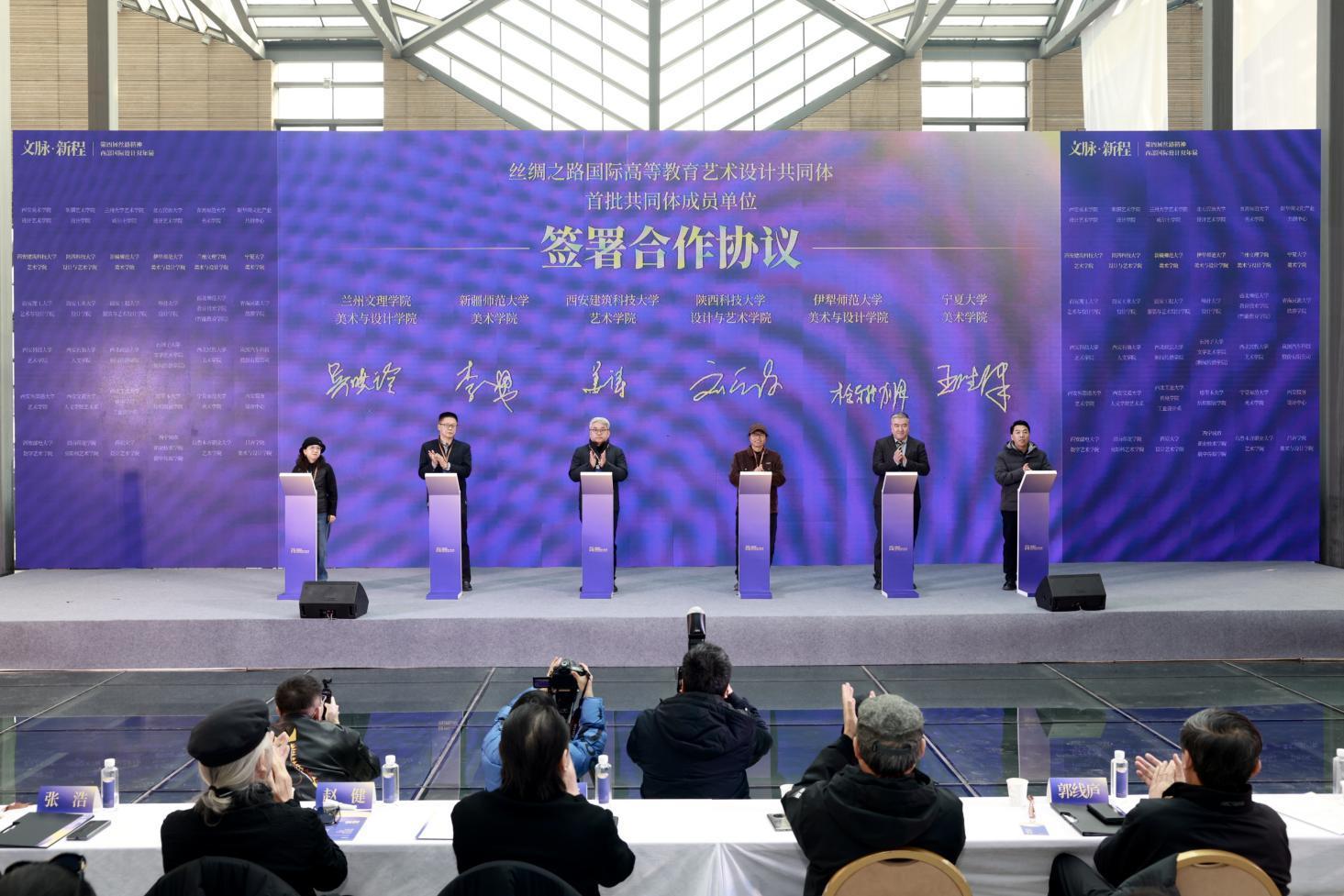 開幕式上,由西安美術(shù)學(xué)院設(shè)計(jì)藝術(shù)學(xué)院發(fā)起,聯(lián)合西北五省相關(guān)高校設(shè)計(jì)、藝術(shù)學(xué)院及行業(yè)協(xié)會(huì)的“絲綢之路國(guó)際高等教育藝術(shù)設(shè)計(jì)共同體”宣告成立。首批48家成員單位在開幕式上分別簽署了合作協(xié)議。