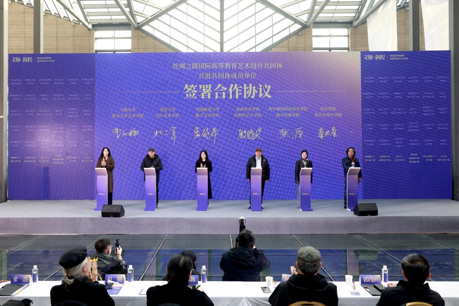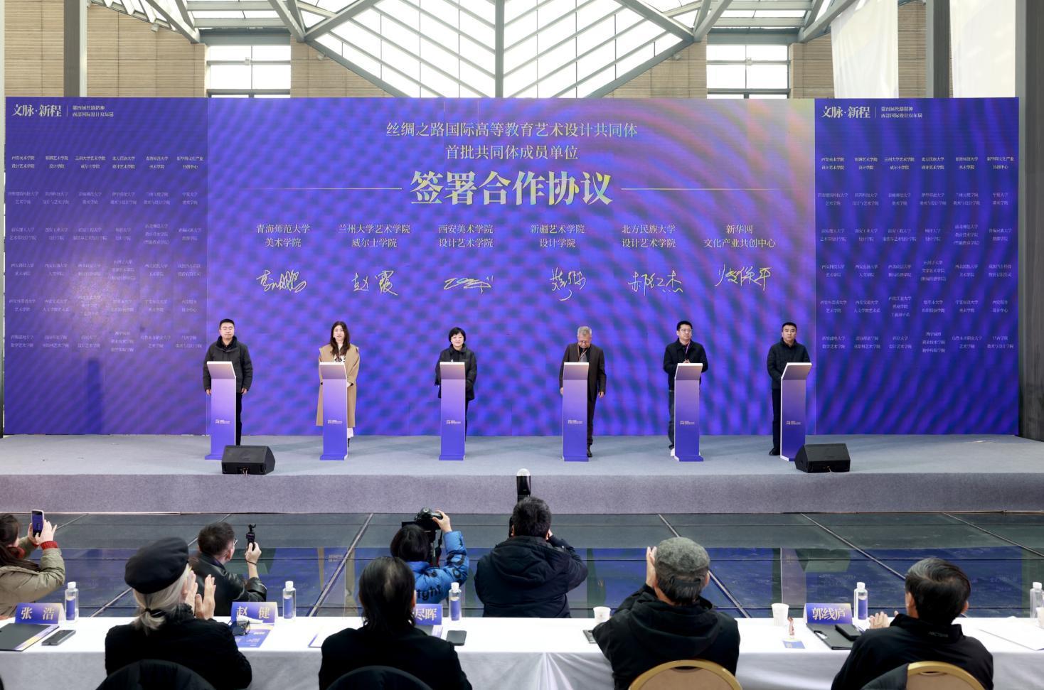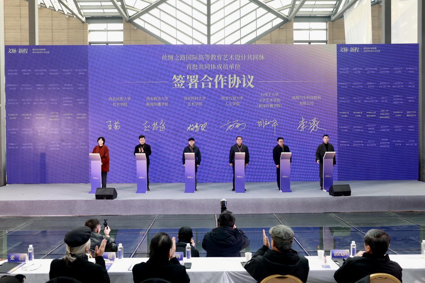 開幕式上,由西安美術(shù)學(xué)院設(shè)計(jì)藝術(shù)學(xué)院發(fā)起,聯(lián)合西北五省相關(guān)高校設(shè)計(jì)、藝術(shù)學(xué)院及行業(yè)協(xié)會(huì)的“絲綢之路國(guó)際高等教育藝術(shù)設(shè)計(jì)共同體”宣告成立。首批48家成員單位在開幕式上分別簽署了合作協(xié)議。