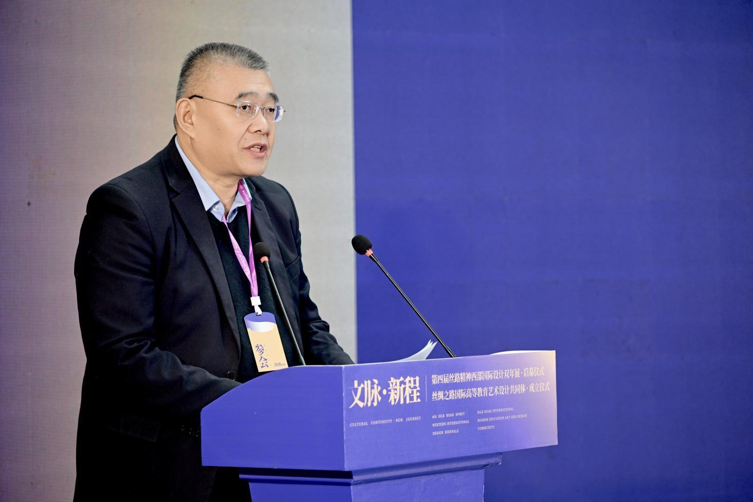 韓緒主任首先祝賀論壇開幕。他表示,絲路精神是開放包容、互學(xué)互鑒的精神紐帶,設(shè)計(jì)則是連接傳統(tǒng)與現(xiàn)代、東方與世界的核心視覺語(yǔ)言。雙年展已走過(guò)十年歷程,本屆主題設(shè)定與國(guó)家戰(zhàn)略高度契合,既是對(duì)歷史文脈的賡續(xù),更是對(duì)文化擔(dān)當(dāng)?shù)嫩`行,其意義遠(yuǎn)超傳統(tǒng)與現(xiàn)代的簡(jiǎn)單對(duì)話,更在于通過(guò)多維度設(shè)計(jì)探討與文化價(jià)值挖掘,充分彰顯了專業(yè)院校與雙年展的時(shí)代價(jià)值。期待絲綢之路國(guó)際高等教育藝術(shù)設(shè)計(jì)共同體集結(jié)西北五省區(qū)設(shè)計(jì)力量與絲路沿線資源深度融合,催生更具包容性的設(shè)計(jì)理念與更富生命力的創(chuàng)作生態(tài),為中國(guó)設(shè)計(jì)行業(yè)的協(xié)同發(fā)展提供可復(fù)制、可推廣的實(shí)踐范式,助力絲路文化在設(shè)計(jì)領(lǐng)域的傳承與創(chuàng)新。
