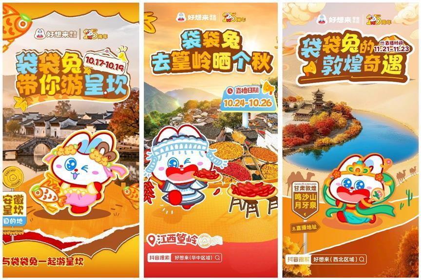 10-12月,好想來抓住文旅市場(chǎng)新機(jī)遇,推出“袋袋兔的奇妙秋游”直播活動(dòng),將直播間搬到全國(guó)各地的特色文旅目的地,創(chuàng)新出“零食+文旅”融合直播的新模式,為全國(guó)消費(fèi)者帶來更多的新奇體驗(yàn)。