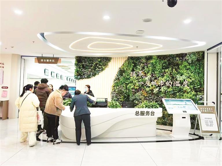 與傳統政務大廳相比,這里的整體氛圍更顯柔和。總服務臺背景墻以綠植裝飾,上方寫著“服務一座城市的溫度”。