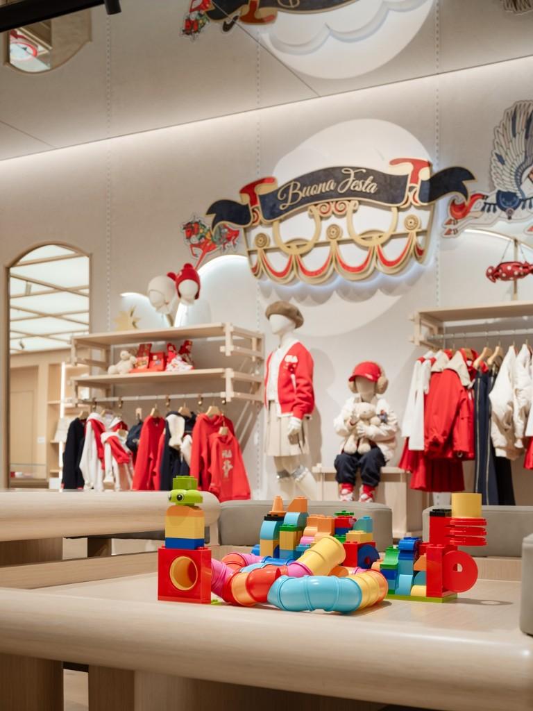 西安壹號店名中的“TOPIA”,靈感源于“烏托邦”(Utopia),寓意在此構筑一個“以消費者為中心”的理想空間。作為一個源于意大利、擁有逾百年歷史的運動時尚品牌,FILA以“雙城序”為概念打造該門店的整體空間敘事,不僅融合了古羅馬的建筑美學與長安盛景,更還原了品牌百年歷史中的傳奇時刻。消費者在此得以沉浸式感受FILA的意式血統,并了解品牌在運動時尚領域的深厚積淀。以文化敘事為脈絡,FILA TOPIA構建了以“意動永恒”“海絲逐浪”“未來唐韻”和“絲路奇境”為主題的四大場景動線,并依次對應了專業運動、鞋履、都市生活與潮流時尚、兒童四大產品區域。FILA首次將旗下全矩陣產品以空間場景化的布局集中于同一門店,讓不同年齡段、不同穿著場景需求的顧客均能在此選購所需,兌現從滿足“一個人”的個性化需求,到服務“一家人”的家庭消費,并最終拓展至“一群人”的社群化場景的品牌承諾。