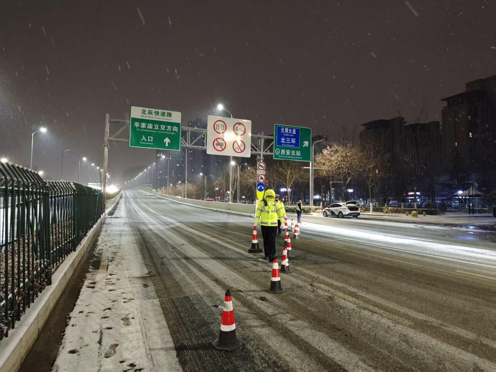轄區(qū)北二環(huán)、朱宏路、北辰快速路等主干道路及高架路段是此次保障的重中之重。大隊(duì)民輔警分組編隊(duì),實(shí)行24小時(shí)輪班巡邏機(jī)制,對(duì)重點(diǎn)路段開展拉網(wǎng)式排查,實(shí)時(shí)監(jiān)測(cè)路面結(jié)冰、積水情況,及時(shí)處置車輛拋錨等突發(fā)狀況。同時(shí),大隊(duì)主動(dòng)加強(qiáng)與城管、路政等部門的協(xié)同聯(lián)動(dòng),建立應(yīng)急處置聯(lián)絡(luò)群,根據(jù)路面情況精準(zhǔn)調(diào)配機(jī)械作業(yè)力量,不間斷開展融雪劑拋灑、積雪清理工作,做到“雪情不消、人員不撤、作業(yè)不停”。