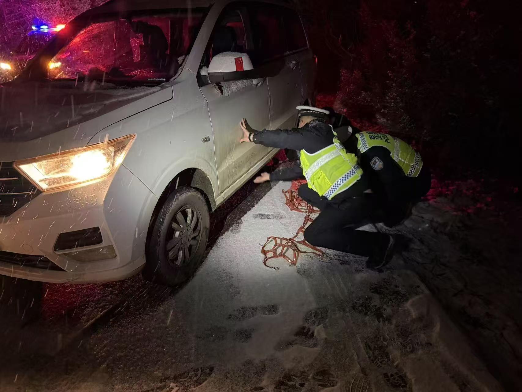 十五分鐘,防滑鏈穩穩裝好。民警又仔細檢查輪胎,叮囑道:“慢點開,難走就靠邊,打電話給我們!”