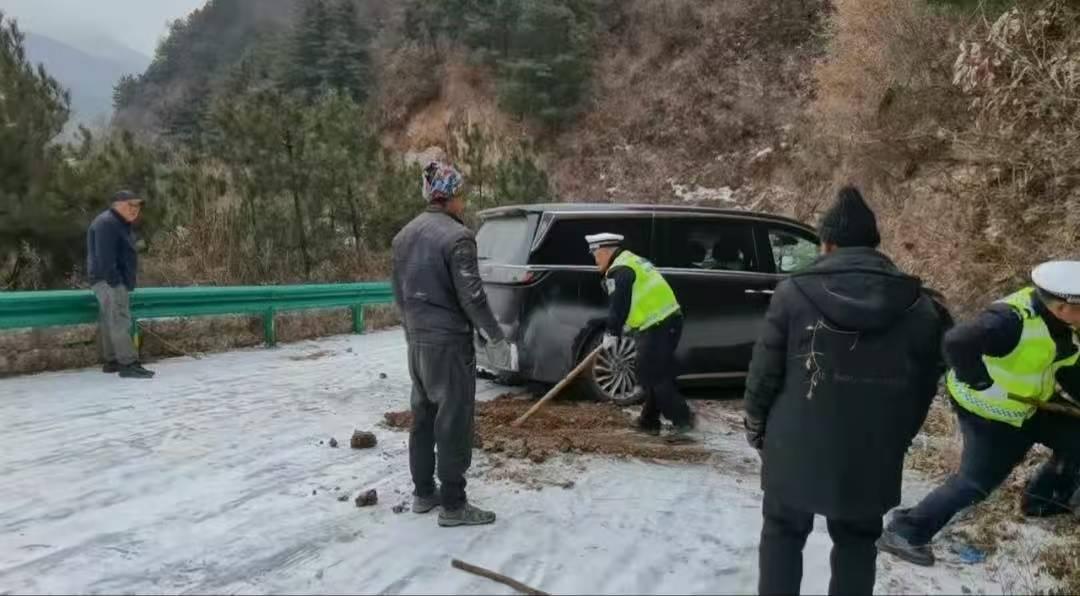 沒有融雪劑,他們就地取材——鏟路邊沙土、碎石,一鍬一鍬,均勻撒在冰面上。 “這方法土,但管用!”一位老民警笑說,“沙土增摩擦,枯草也能防滑,山里人都知道!”