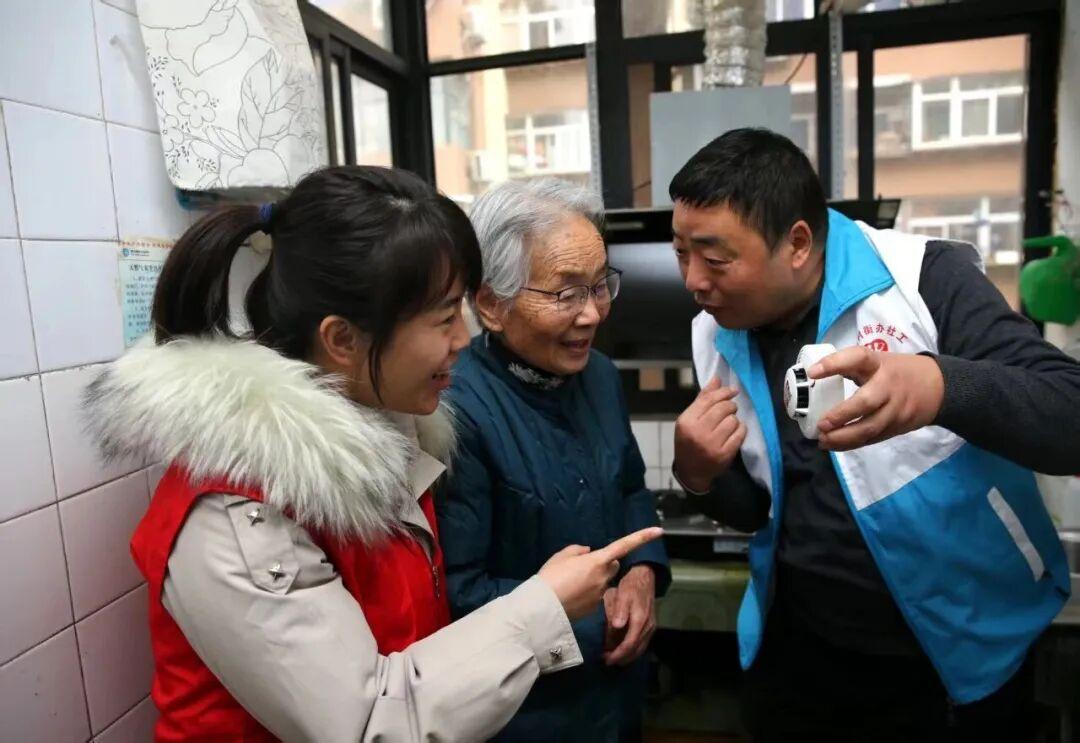 △西安市碑林區(qū)黃雁社區(qū)工作人員上門為老人介紹煙霧報警器功能。