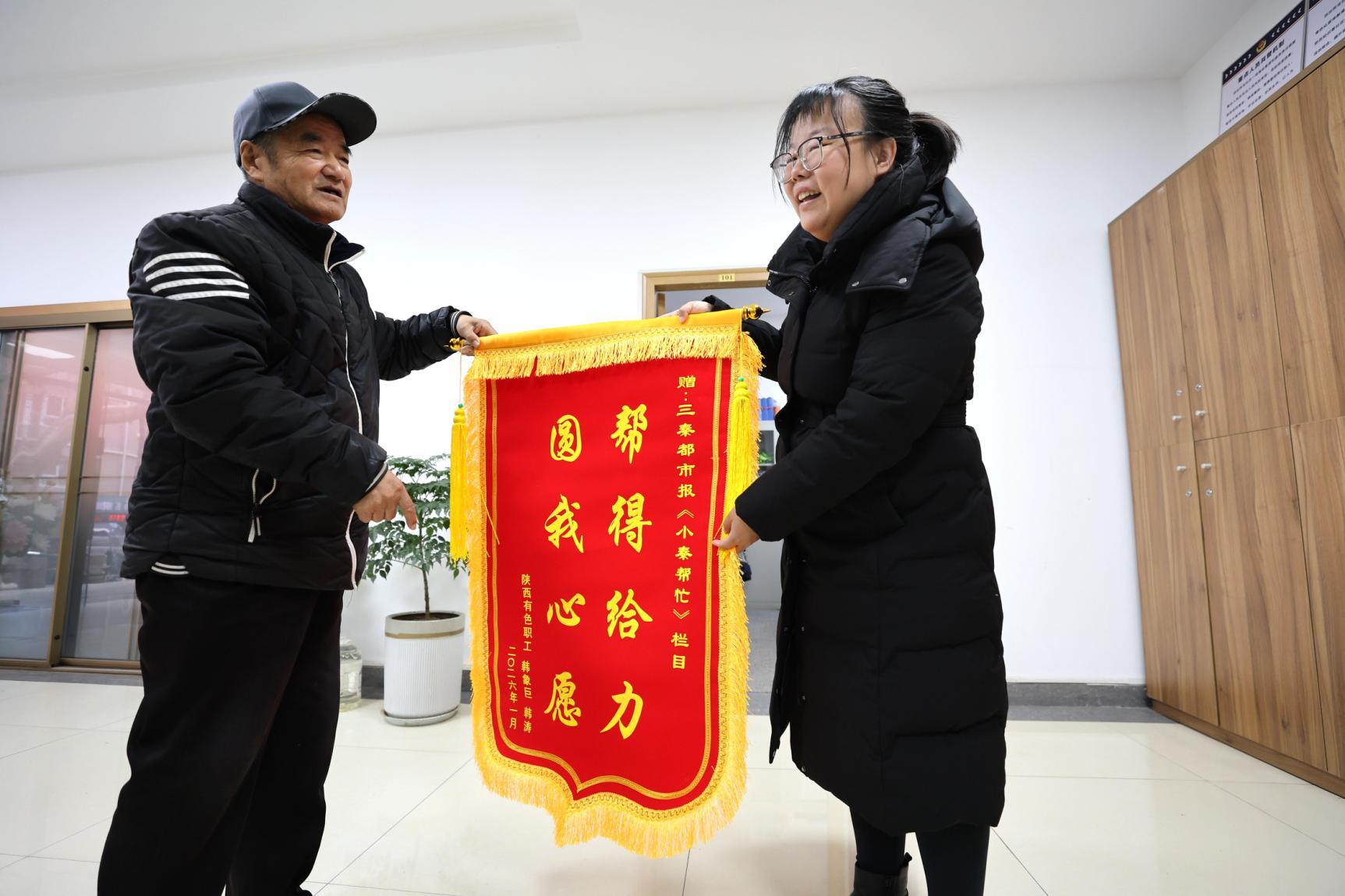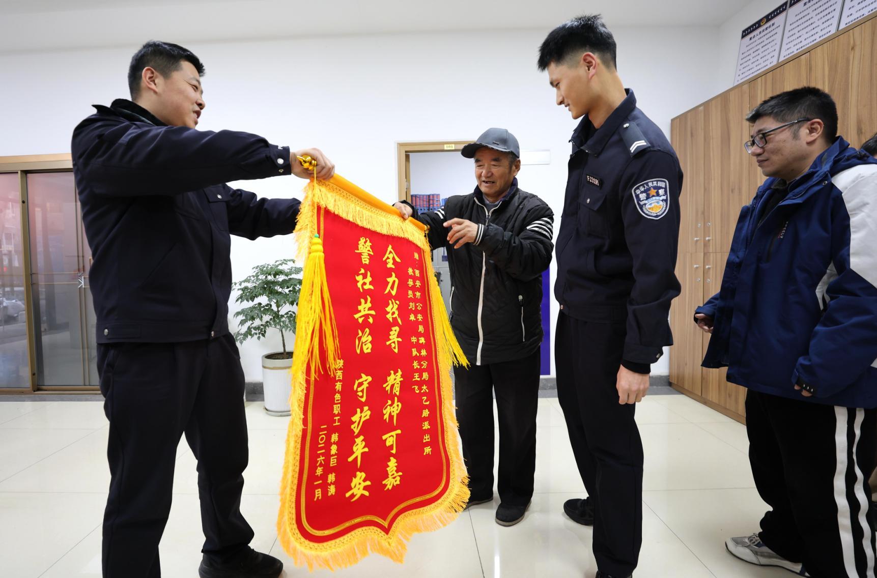 隨后,韓大爺和兒子韓濤將錦旗逐一送出:給太乙路派出所的錦旗上寫著“全力找尋精神可嘉 警社共治守護平安”,民警王飛表示,守護這份善意是職責所在;送給社區的錦旗上寫著“細心走訪 為民服務”;給“小秦幫忙”欄目寫的則是“幫得給力 圓我心愿”。