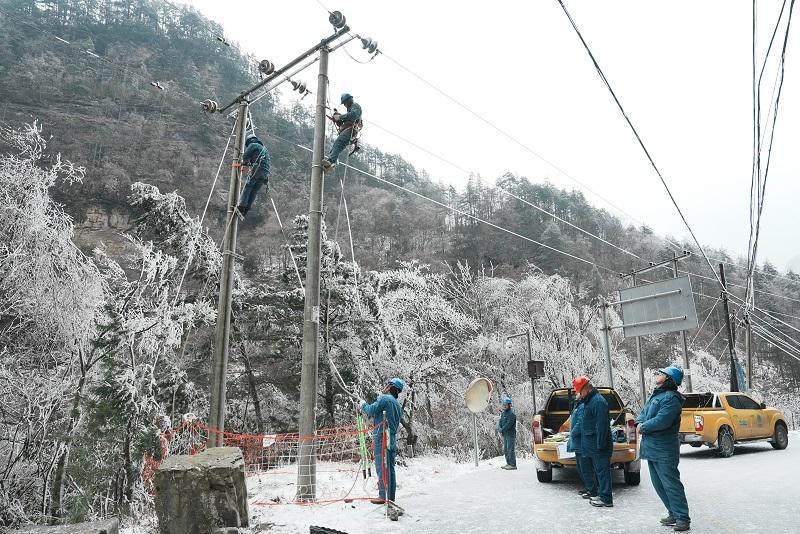 1月20日,正值大寒。清晨,黎坪氣溫降至零下8攝氏度。搶修隊(duì)伍抵達(dá)位于景區(qū)天書崖附近的故障點(diǎn)。眼前,斷裂的導(dǎo)線懸掛崖壁,電桿、橫擔(dān)被冰雪覆蓋,作業(yè)面狹窄濕滑。常規(guī)登桿工具已無法使用,搶修工作面臨嚴(yán)峻考驗(yàn)。