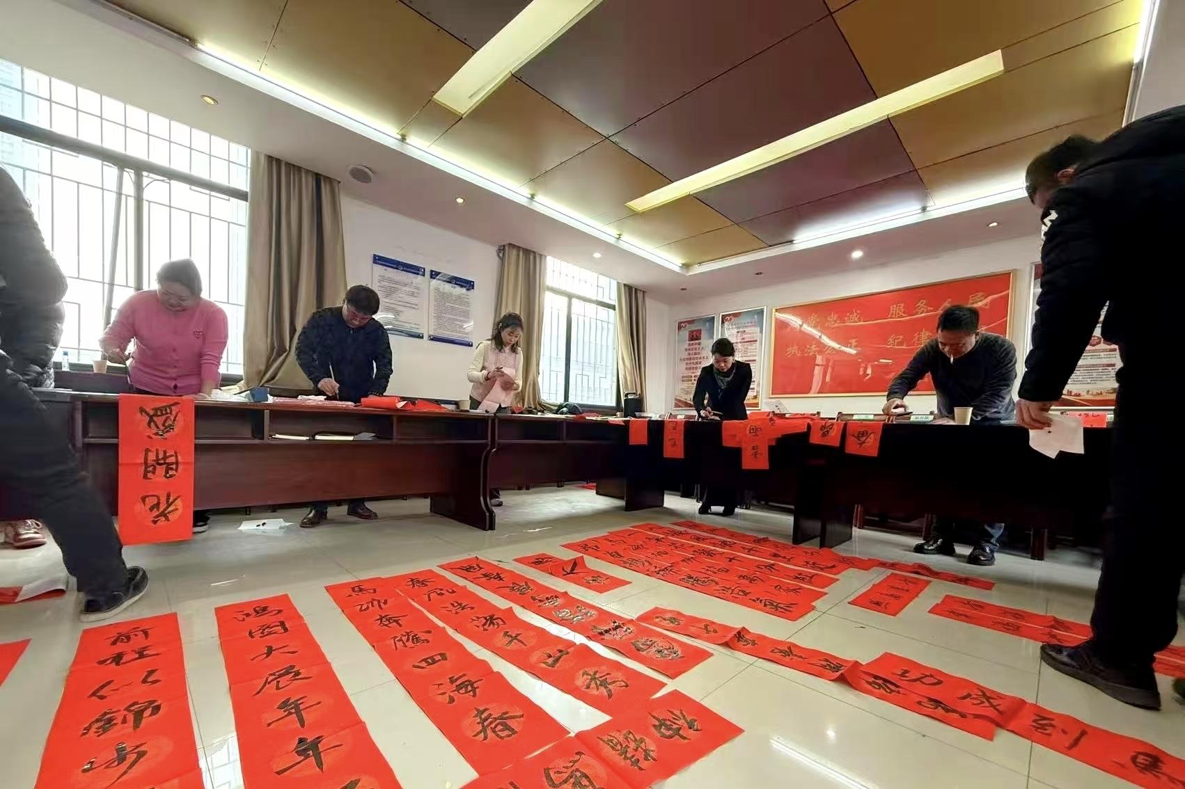 活動過程中,一位民警面帶赧色,卻又難掩期待,誠懇地向書法家說道:“老師,我們打算給派出所大門貼春聯,可目前準備的春聯紙長度好像不太夠,您看能不能幫我們想想辦法呀?”書法家聽聞后,嘴角上揚,爽朗回應道:“這好辦,要不咱來個‘節節高’,把春聯紙拼接起來。”民警郭彪埋頭在眾多春聯內容中尋找心儀之選,最終他選定了“事業騰飛攬青云,馬蹄捷報映曉日,橫批:步步高升”。“這是給弟弟送的新年禮物,希望他在新的一年平安順意。”郭彪笑著說。