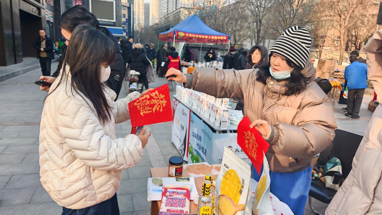 走進集市核心區,琳瑯滿目的攤位讓人目不暇接。社區黨委牽頭對接優質商戶,帶來新鮮優質的蜂蜜農產品、肉禽蛋奶;日用百貨區貼心備齊鍋碗瓢盆、家用小工具,真正實現“居民抬腳就能買,省心省錢又安心”。來自轄區的愛心企業在長桌前排開陣仗,一拓一印,鮮亮的“福”字躍然而出,“拿穩嘍,這可是您親手‘請’來的福。”“這份心意太珍貴了,我得好好貼起來,沾沾福氣!”每個攤位前都擠滿了熱情的居民,認真挑選食材、比對百貨,黨委搭建的集市平臺,讓煙火氣里滿溢幸福滋味。
