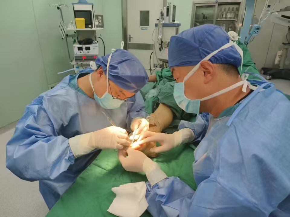 手外中心王恒軍副主任醫師、魏和旺主治醫師在吳鵬主任醫師及西京醫院臧成五副主任醫師的指導下,爭分奪秒完成術前評估與準備,迅速為患者開展斷足再植手術。