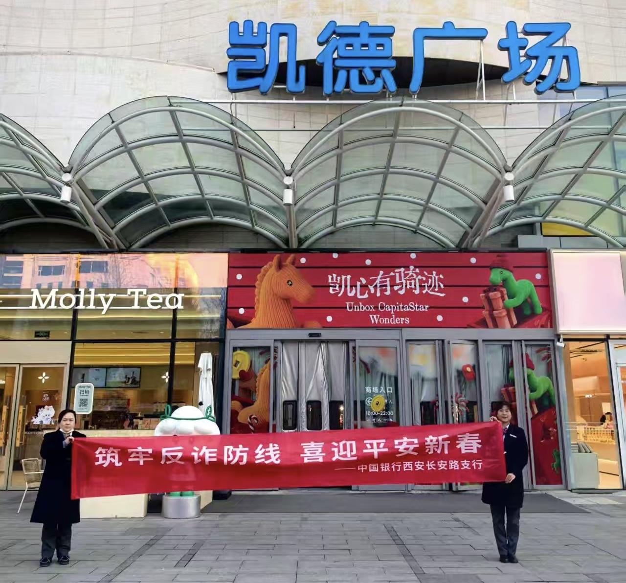 來到凱德廣場,銀行員工在人流密集的商場入口旁拉起橫幅,向過往消費者、商戶普及反詐知識。針對春節(jié)期間“年貨詐騙”“刷單返利詐騙”等高發(fā)場景,銀行員工用通俗易懂的語言拆解騙局邏輯。