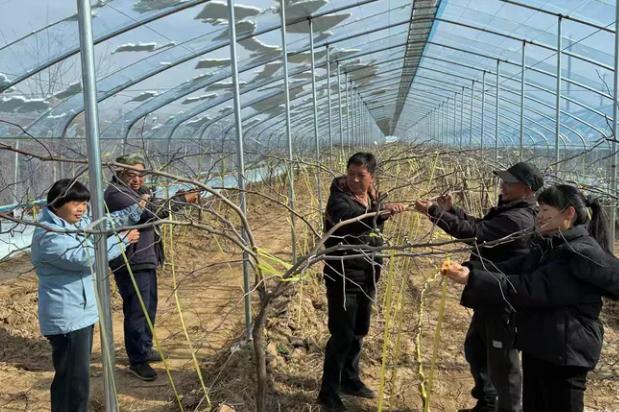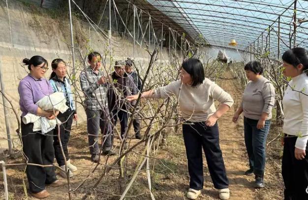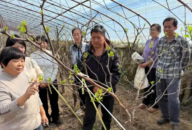 “下雪后棚里溫度低,咱得把溫濕度控好,萌芽期別多施氮肥,多補點磷鉀肥,修剪也得看著樹來,既要保證當年結果,也要促發更新枝!”高級工程師周愛英和技術員一邊扒著棗樹枝看萌芽,一邊扯著家常講技巧,從溫度調控、科學施肥到輕剪促芽,每一點都講得明明白白。