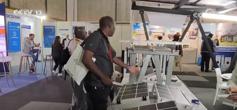 這個新能源產品可以說是非常具有非洲特色,它的上面是兩片光伏板,下面是兩個可以調整角度的攝像頭,用光伏發電來支持攝像頭的運行,還有把路燈、攝像頭和光伏結合在一起的。