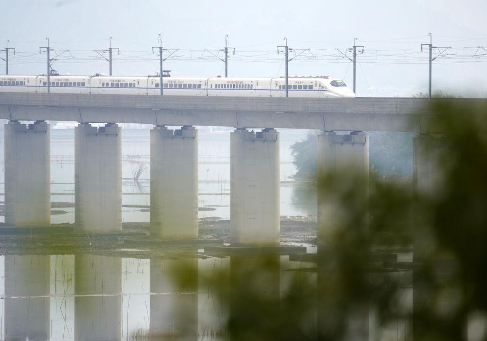 ↑ 1月25日,動車組列車在福建省廈門市境內行駛。新華社發(曾德猛 攝)