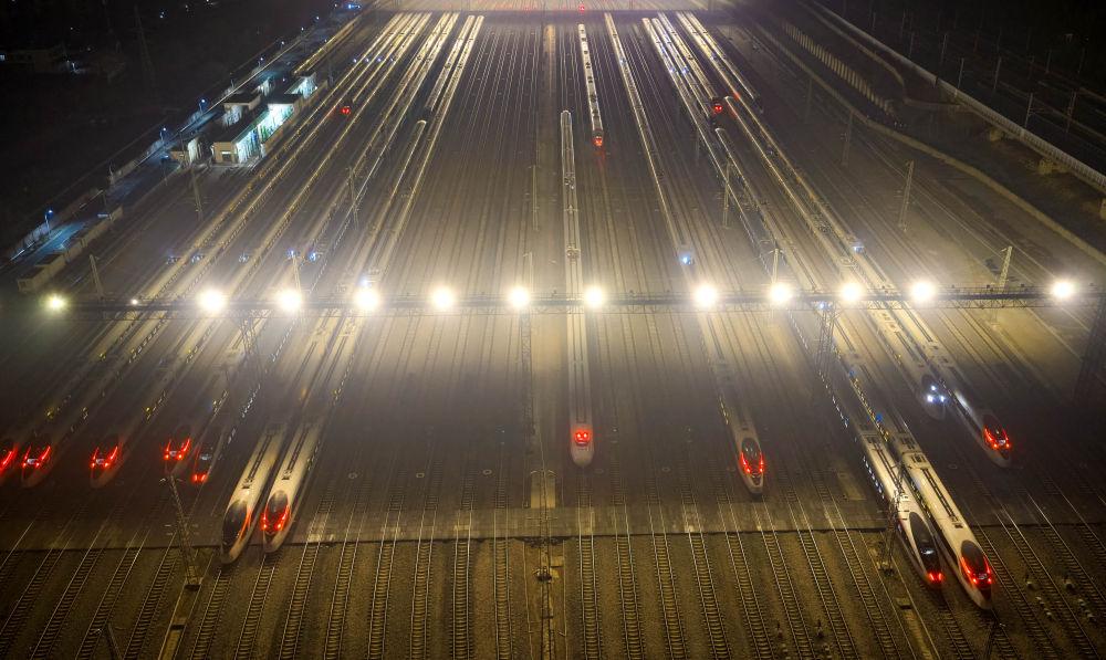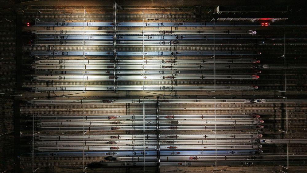 ↑ 這是1月25日凌晨在昆明車輛段昆明南動車運用所拍攝的動車組列車(無人機照片)。新華社發(楊紫軒攝)