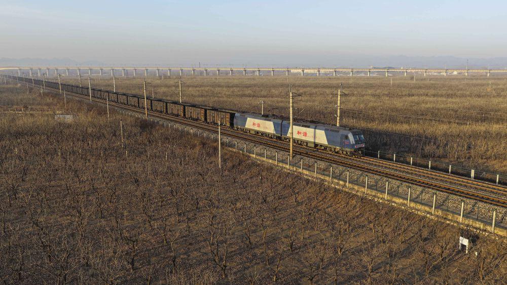 ↑ 1月25日,一列運煤專列途經大秦鐵路河北省遵化市境內駛向秦皇島方向(無人機照片)。新華社發(劉滿倉 攝)