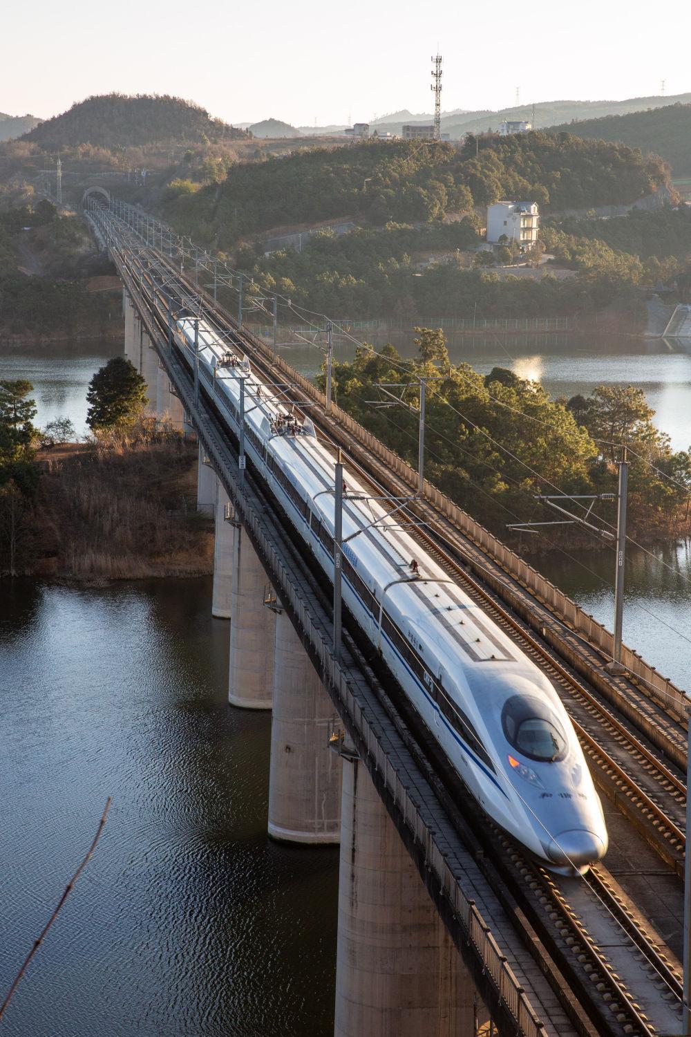 ↑ 1月25日,動車組列車從云南省曲靖市馬龍區舊縣街道車馬碧水庫上駛過。新華社發(楊俊鵬 攝)