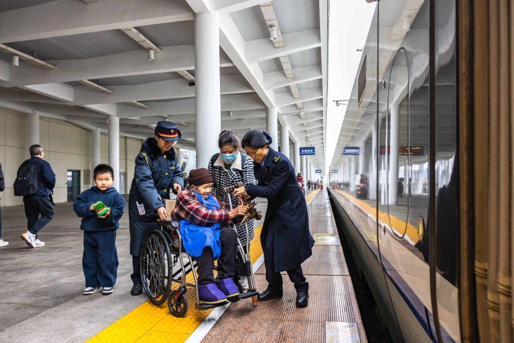 ↑ 1月25日,鐵路工作人員在貴州安順西站協助重點旅客乘車。新華社發(陳熙 攝)