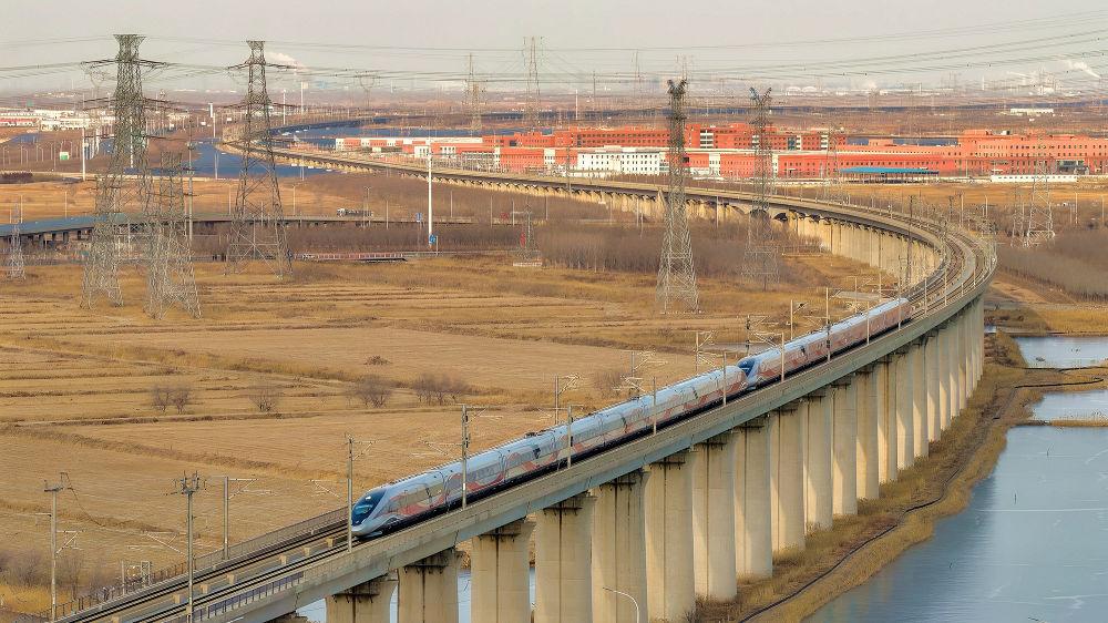 ↑ 1月25日,動車組列車行駛在天津市境內(無人機照片)。新華社發(杜鵬輝 攝)
