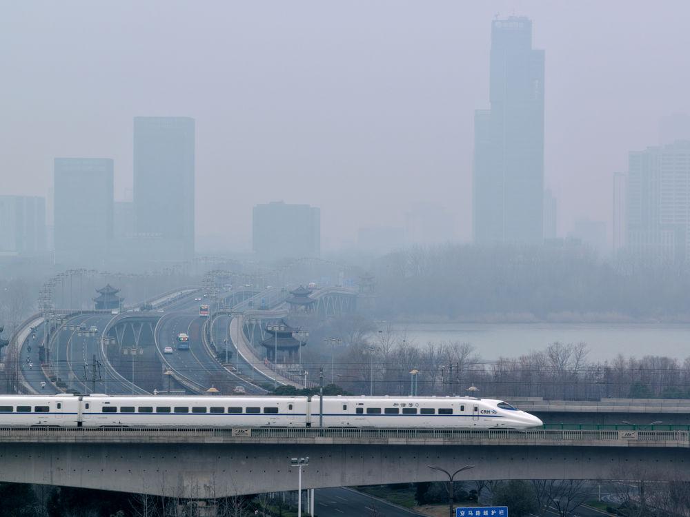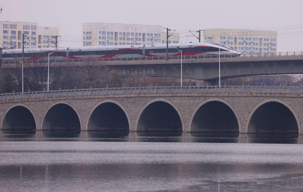 ↑ 1月25日,一列動車組列車在河北省石家莊市境內行駛。新華社發(梁子棟 攝)