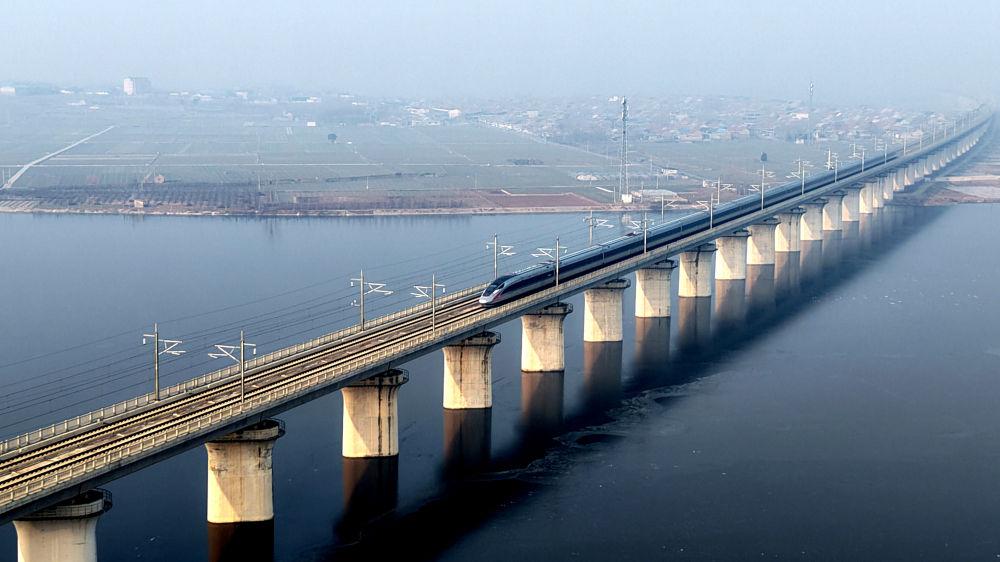 ↑ 1月25日,列車行駛在青榮城際鐵路山東煙臺段。新華社發(唐克 攝)