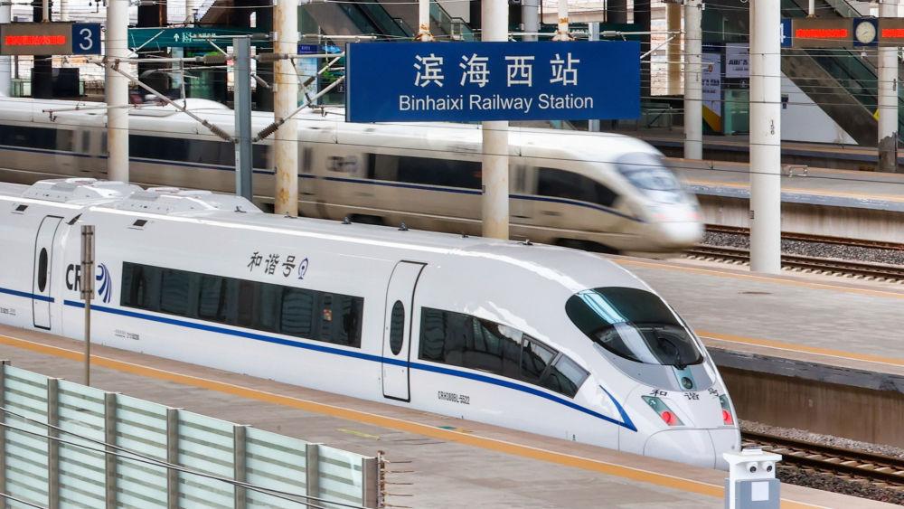 ↑ 1月25日,在天津市濱海新區,動車組列車準備駛出天津濱海西站。新華社發(杜鵬輝 攝)