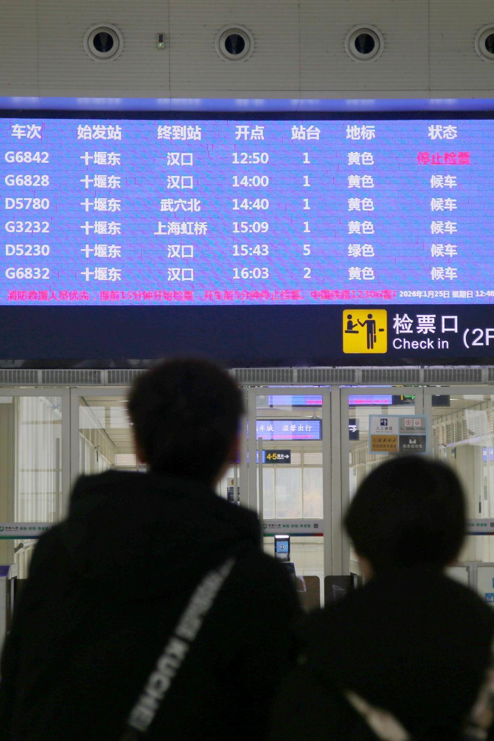 ↑ 1月25日,旅客在湖北十堰東高鐵站查看車次。新華社發(曹忠宏 攝)