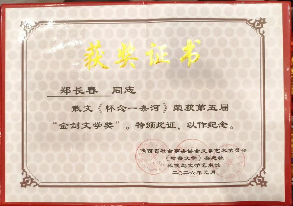 三秦都市報(bào)-三秦網(wǎng)訊(記者 夏明勤)1月25日,由陜西省社會事務(wù)協(xié)會文學(xué)藝術(shù)委員會、《檢察文學(xué)》雜志社、張俊彪文學(xué)藝術(shù)館聯(lián)合舉辦的第五屆“金劍文學(xué)獎”頒獎典禮在陜西咸陽舉行。頒獎典禮上,知名作家鄭長春的《懷念一條河》與張俊彪的《省委第一書記》、張東旭的《擁抱》、黃振濤的《那年那月師范情》等35篇(部)散文作品獲得散文類殊榮。