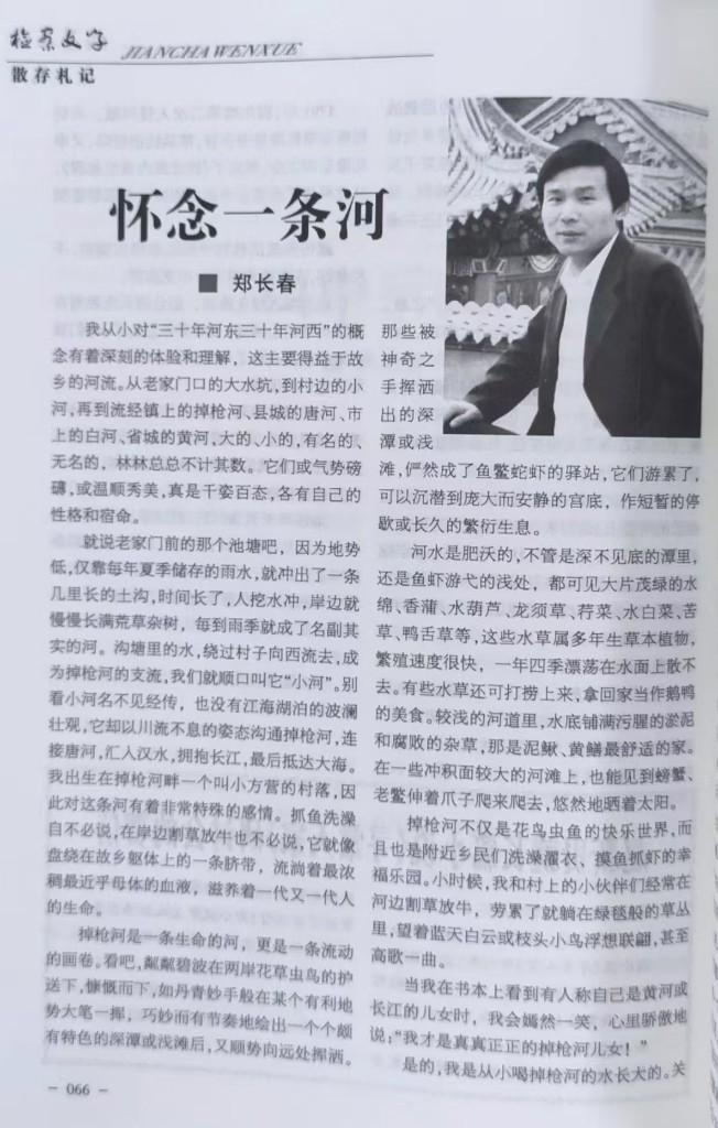 此次獲獎作品《懷念一條河》,既是一篇描述河流的自然生態(tài)文學(xué)作品,也是作家鄭長春為自己長篇小說《掉槍河傳》寫的一篇后記。掉槍河是豫南大地一條充滿傳奇而命運(yùn)多舛的河流,千百年來在河的兩岸發(fā)生過許多可歌可泣的故事,至今“岳飛槍挑金兀術(shù)”“金花公主殉情掉槍河”的歷史典故仍在這里代代相傳。鄭長春從小生活在掉槍河畔,是喝著掉槍河水、聽著掉槍河故事長大的,他對這條河的前世今生了如指掌。離開家鄉(xiāng)去外地求學(xué)后,掉槍河便成了他永不褪色的記憶,成了他揮之不去的鄉(xiāng)愁。這篇用隨筆形式書寫的《懷念一條河》,筆觸細(xì)膩,文字生動,是他在一個(gè)個(gè)寂寞的夜晚,飽蘸著思念淚花和飽滿激情揮就的“鄉(xiāng)愁之作”。他在這篇數(shù)千字的散文作品中,不僅詳細(xì)地描寫了掉槍河流域的野生動植物資源、萬物生長及物候變化,更重要的是鋪展開一幅中原河流生態(tài)系統(tǒng)的自然與博物學(xué)畫卷、一段人與自然的傳奇歷程、一張河流生命共同體的巨大關(guān)系網(wǎng),為讀者呈現(xiàn)了具有鮮明地域特色和人文精神的自然世界。2024年第3期《檢察文學(xué)》雜志發(fā)表后,引起社會廣泛關(guān)注。