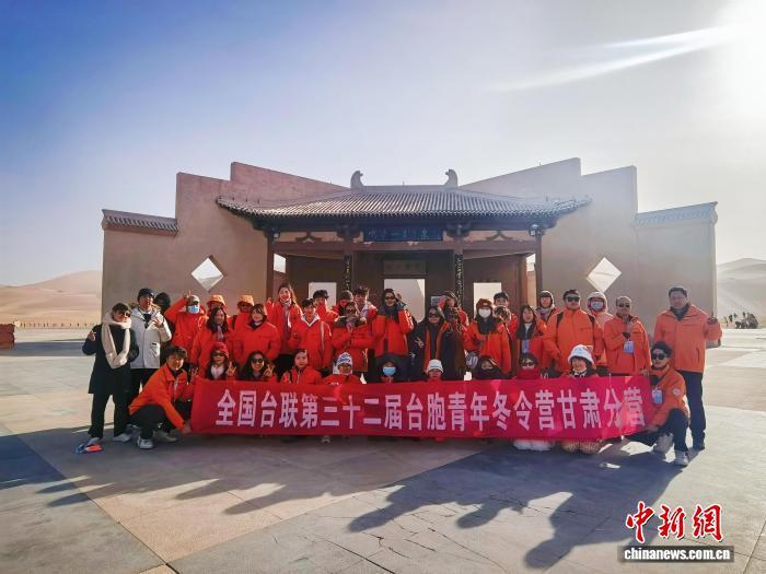 1月23日,全國臺聯(lián)第三十二屆臺胞青年冬令營甘肅分營營員在敦煌鳴沙山月牙泉合影留念。申志波 攝
