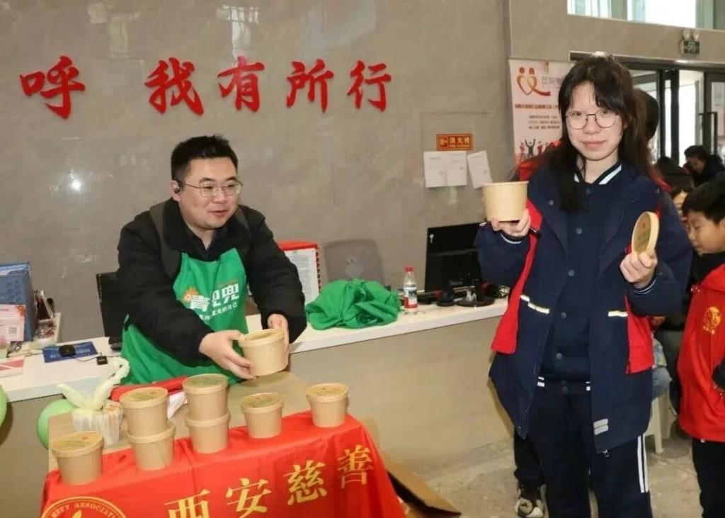 慰問環節,米、面、油等生活物資一一發放。更暖心的是,西安慈善主旋律、青兜兜、三獻三支志愿服務隊送上300份臘八粥。
