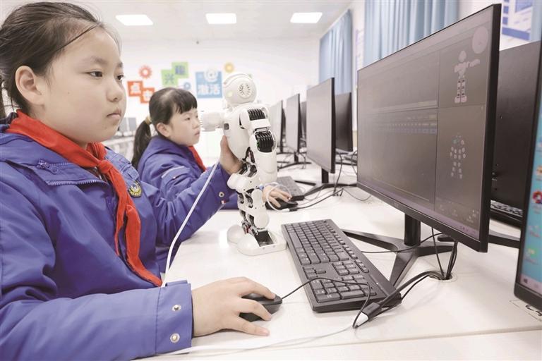 近日,記者在西安市碑林區鐵五小學的信息科技教室看到,課堂上,學生們屏息凝神地觀察著程序運行的結果。“你看,我的機器人會跳武術操!”該校四年級學生衡韻涵興奮地按下啟動鍵,向記者演示著如何通過指令讓機器人完成轉體、劈叉等動作。她告訴記者,學習人工智能課程近一個學期,這種“親手賦予機器靈魂”的成就感讓她對科技產生了濃厚興趣。她身旁的另一個同學,一邊熟練地調試著代碼,一邊對記者說:“將來,我想自己做一個能感知人類情緒、會跳舞的機器人。”