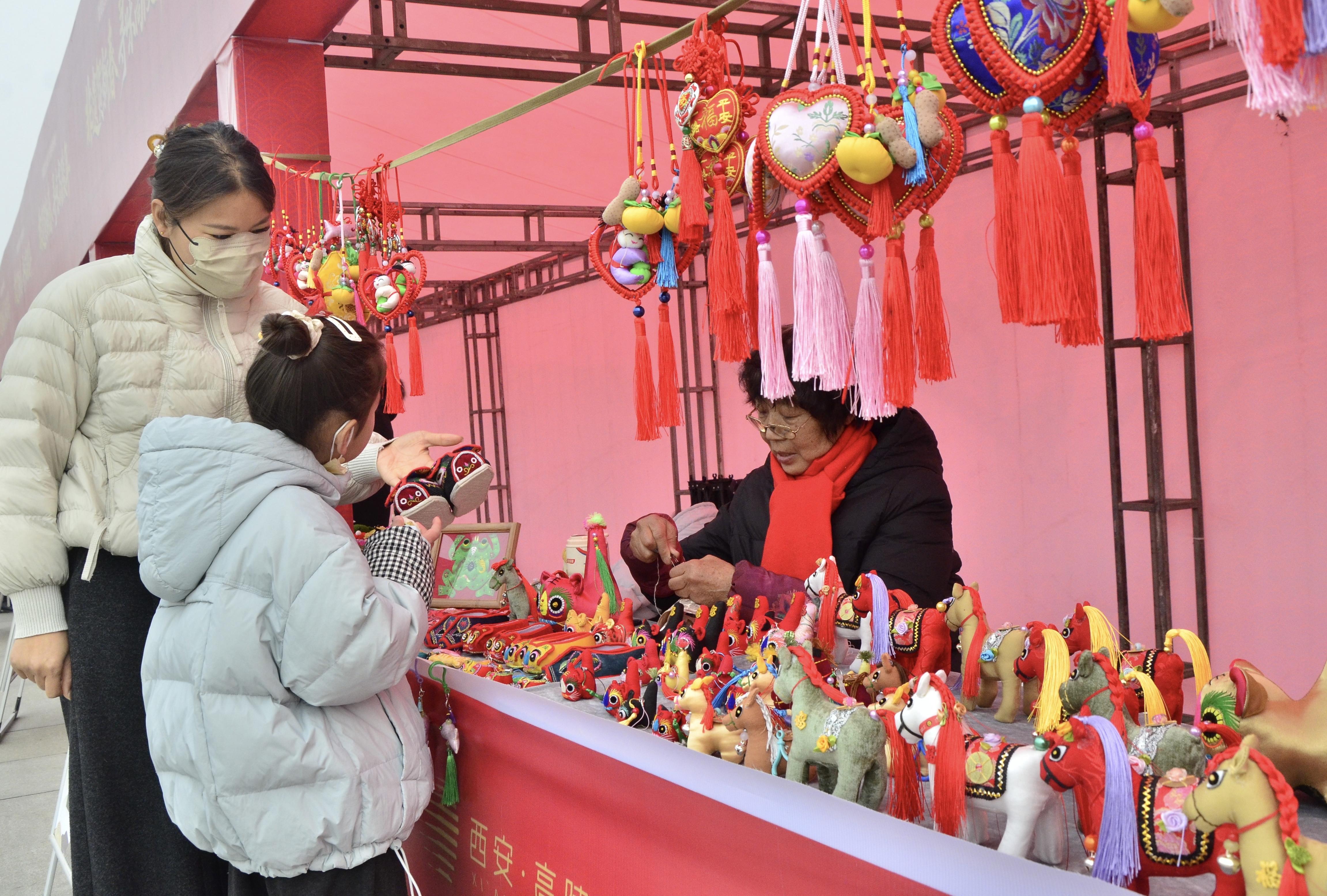 昭慧廣場上,各色展位沿街有序排布,紅燈籠與特色招牌相映成趣,喜慶氛圍撲面而來。作為核心亮點,“土特產”及非遺展示區人氣爆棚,高陵剪紙、傳統花饃、手工漆扇、精美刺繡等非遺精品悉數亮相,各級傳承人現場“亮絕活”,手把手向群眾傳授傳統技藝,讓大家近距離感受匠心魅力。