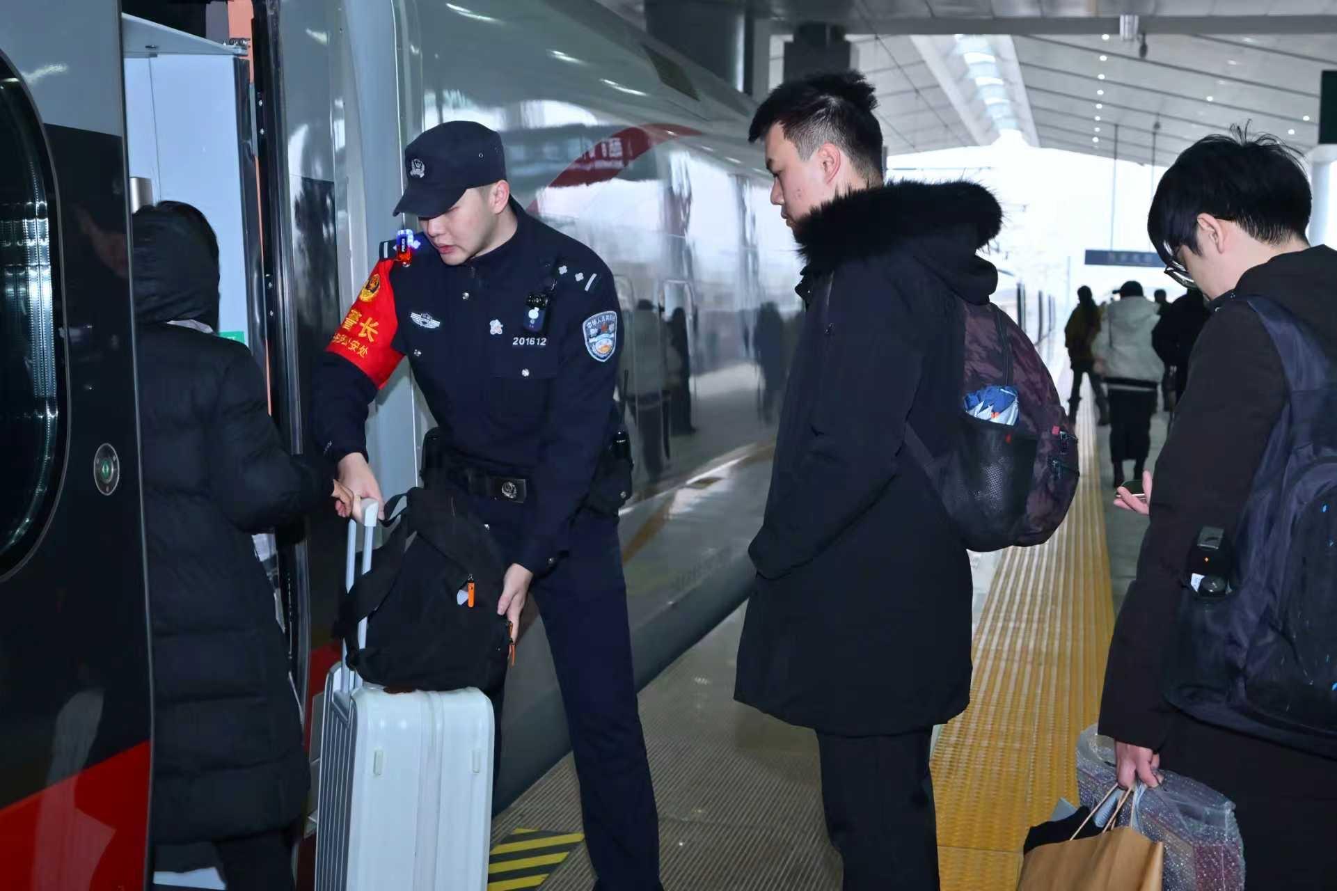 “各位旅客您好,歡迎乘坐首趟延京高鐵G359次列車,我是本次列車乘警,提醒大家看管好隨身行李,切勿將危險品帶入車廂……”列車啟動后,乘警手持擴音器,逐節車廂開展安全宣傳。他們用通俗易懂的語言,向旅客講解高鐵乘車安全須知、防盜竊、防詐騙、應急避險等知識,重點提醒老年旅客、攜帶兒童的旅客注意出行安全,同時耐心解答旅客關于乘車秩序、物品保管等方面的疑問,引導旅客文明乘車、安全出行。