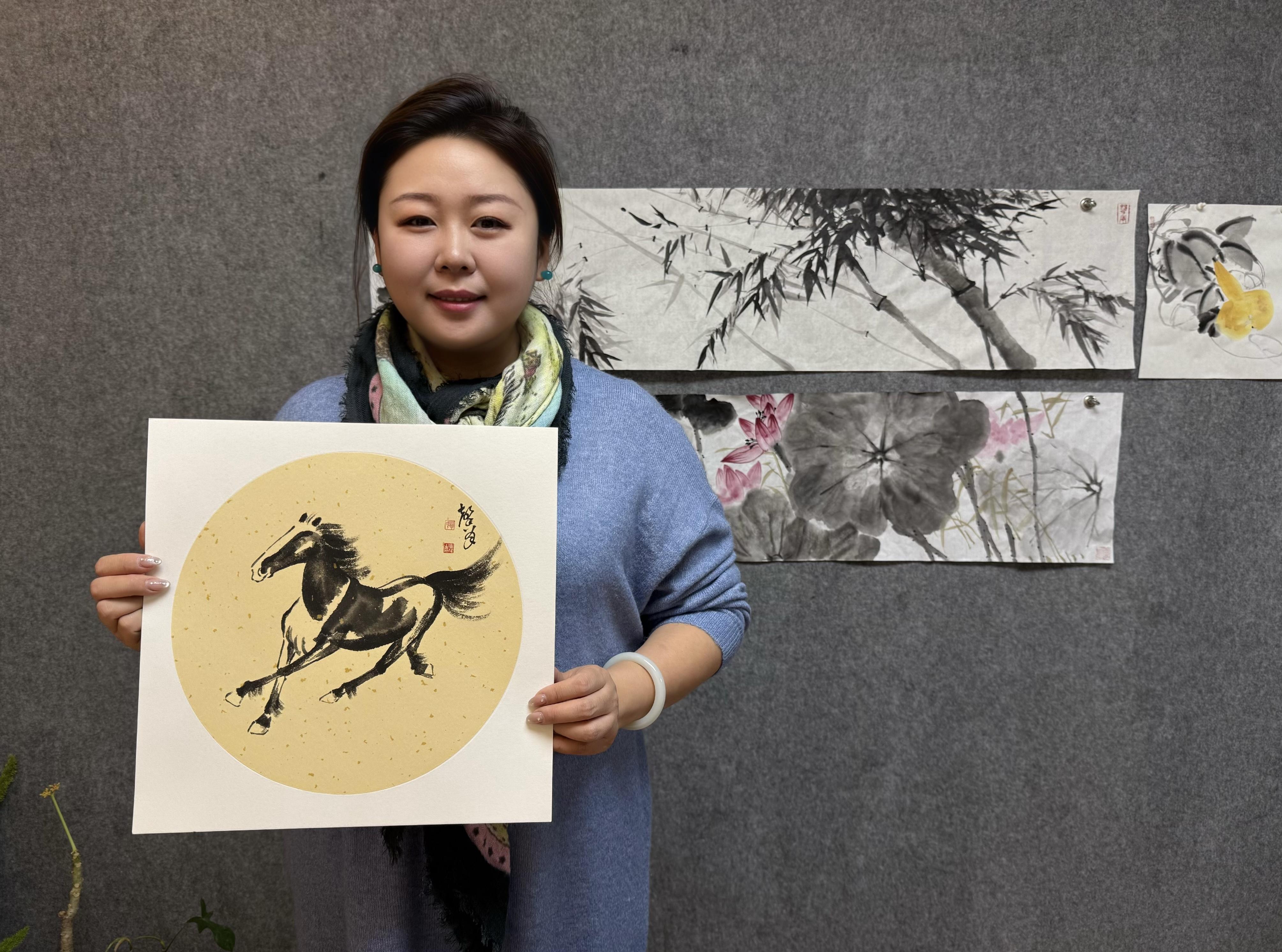 馨月筆下每匹馬的姿態各異,有的昂首嘶鳴,寓意著馬年一鳴驚人;有的低頭奮蹄,象征著腳踏實地、努力奮進?!昂苫ㄔ⒁庵秃兔烂?,荷葉象征著和諧共生,與駿馬相結合,傳達出馬年和諧美好、繁榮昌盛的祝愿。”畢馨月笑著說。