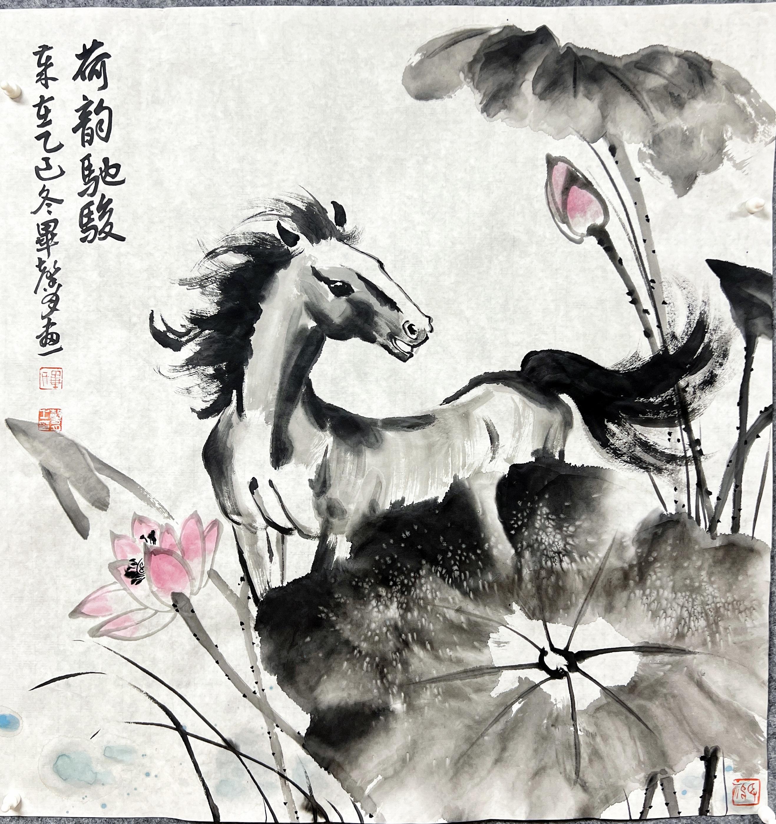 在毓蘭山房畢馨月的工作室里,一幅《駿馬迎春圖》格外引人注目。一匹駿馬騰躍于墨色云海,仿佛要從畫面里奔跑而出,馬蹄踏處濺起朵朵墨荷。
