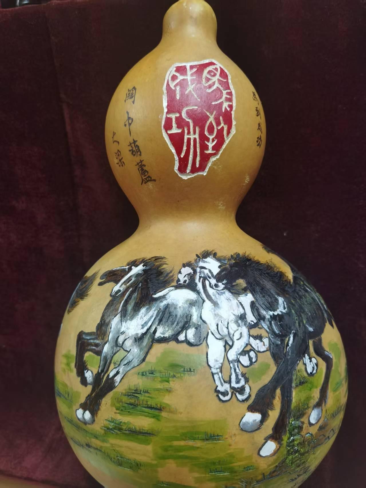來到關中葫蘆刻畫工作室,關中葫蘆刻畫技藝代表性傳承人梁平安正專注地雕琢著一個個葫蘆。形態飽滿的葫蘆上,一匹匹馬的矯健姿態與昂揚精神被濃縮于弧面之上,無論是“駿馬奔騰迎新春”的壯闊,還是“馬到成功福滿門”的吉慶,皆栩栩如生。