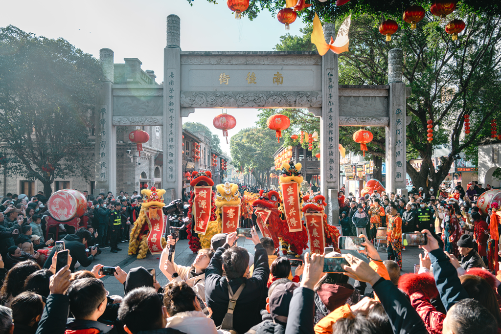 2025年春節(jié)期間,福州三坊七巷南后街牌坊下舞獅表演吸引游客駐足觀看。 福州名城保護(hù)開發(fā)有限公司供圖 陳鑫賢/攝