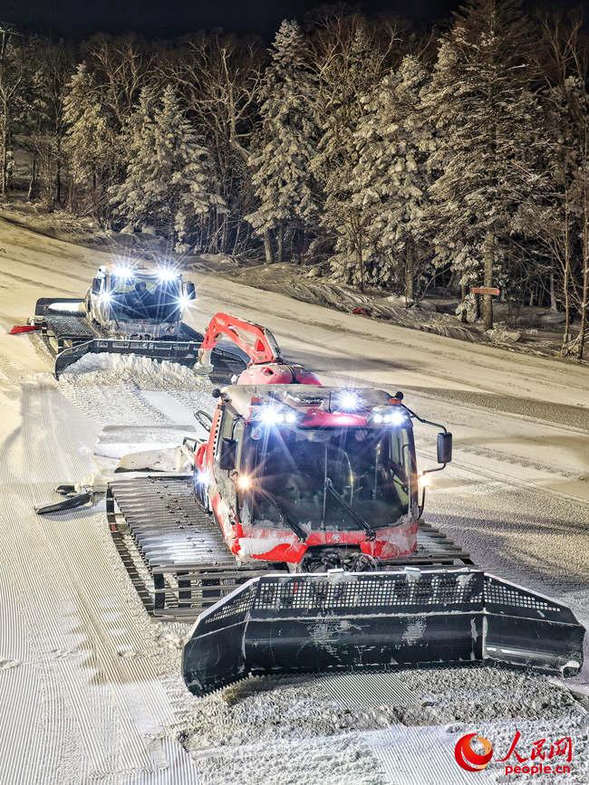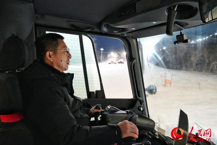 張斌駕駛壓雪機在雪場內平整雪道。人民網記者李洋攝
