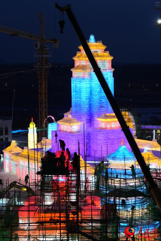 冰為磚、水為泥、燈為飾,打基礎、做鋼架、砌冰墻……最忙時,曲超和5500余名工人夜以繼日,在攝氏零下的氣溫中“玩冰嬉雪”,睫毛上全是凝結的霜花。“冰雪是短暫的藝術,一旦進入冰雪施工季,都得緊抓時間,盡量把施工時間壓縮到最短,這樣留給游客欣賞的時間就會更長。”曲超說。