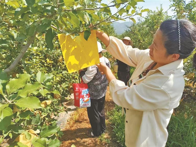 寶雞市科技特派員張嘉園調(diào)查果園病蟲害情況(資料照片)。