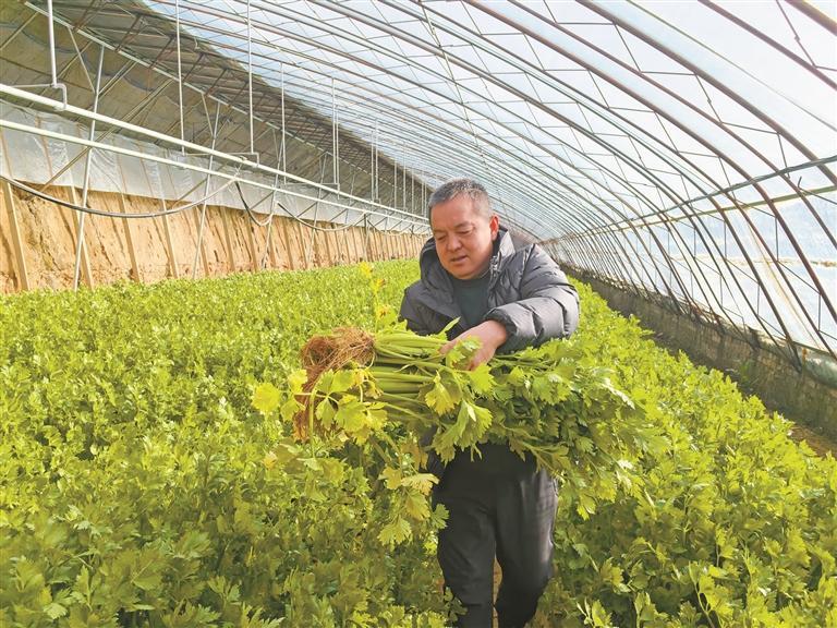 1月9日,靖邊縣東坑鎮金雞沙村村民苗慧平查看芹菜長勢。 本報通訊員 陳治武攝