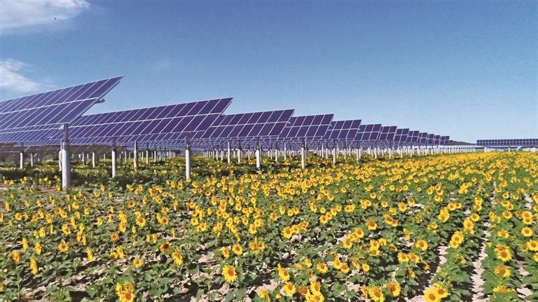 位于合陽(yáng)縣和家莊鎮(zhèn)的渭南光伏領(lǐng)跑基地三合光伏電站內(nèi),光伏板與向日葵花田繪出一幅“農(nóng)光互補(bǔ)”的生態(tài)畫卷(資料照片)。 受訪者供圖
