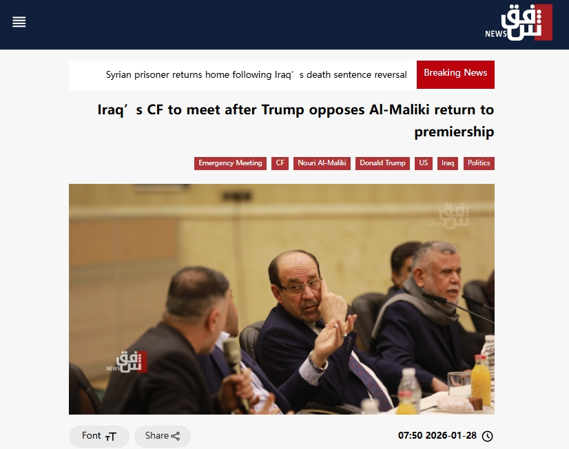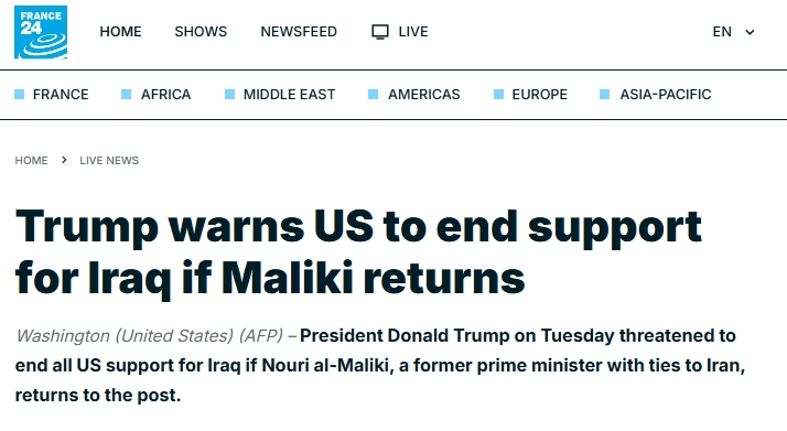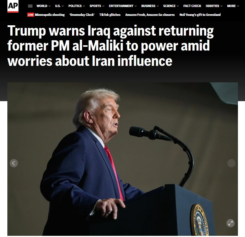 美國總統特朗普當地時間1月27日在社交媒體發文稱,如果伊拉克前總理努里·馬利基再度當選總理,美國將不再“援助”伊拉克。