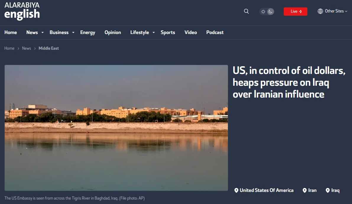 據多家媒體日前報道,當伊拉克政府要求美軍在2020年撤離伊拉克時,美國就曾威脅要切斷伊拉克獲得石油收入的渠道,當時伊方被迫作出了讓步。如今,美國又因為伊朗的因素威脅制裁伊拉克,其中就包括“通過紐約聯邦儲備銀行獲得的重要石油收入”。