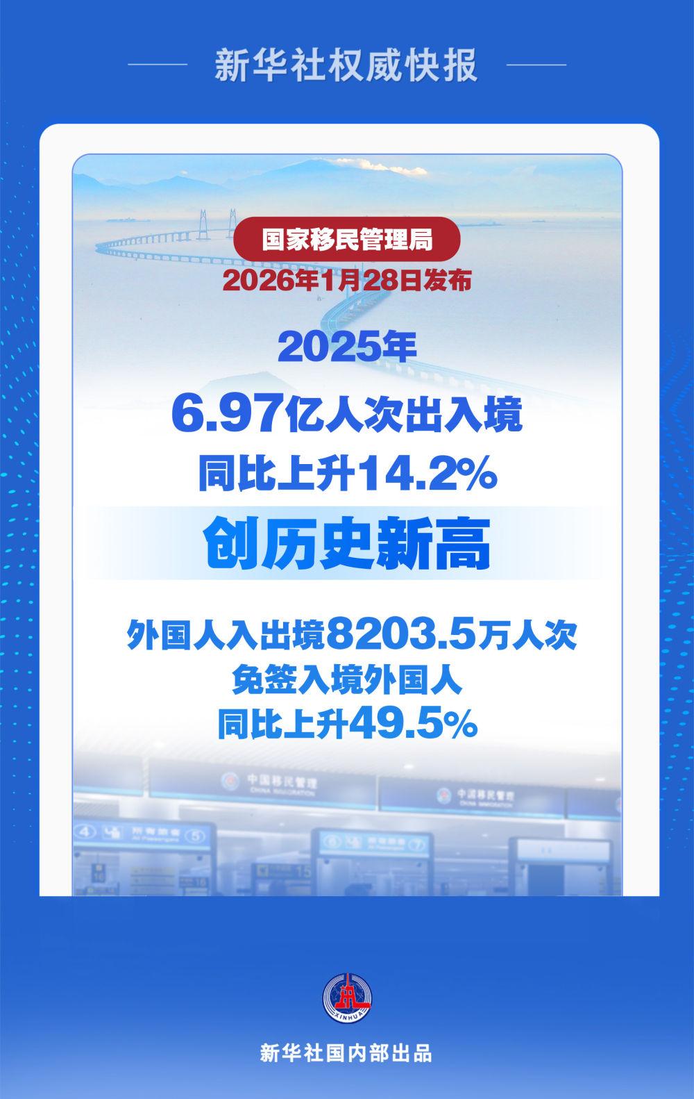 記者1月28日從國家移民管理局新聞發布會獲悉,2025年,全國移民管理機構共查驗出入境人員6.97億人次,同比上升14.2%,創歷史新高。其中,內地(大陸)居民3.35億人次、港澳臺居民2.79億人次,同比分別上升15.1%、10.1%;外國人8203.5萬人次、同比上升26.4%,免簽入境外國人3008萬人次、占入境外國人73.1%、同比上升49.5%。
