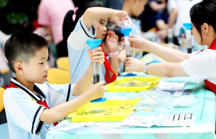 2025年7月5日,小朋友在中國杭州低碳科技館進行科學實驗體驗。新華社發(周方玲攝)