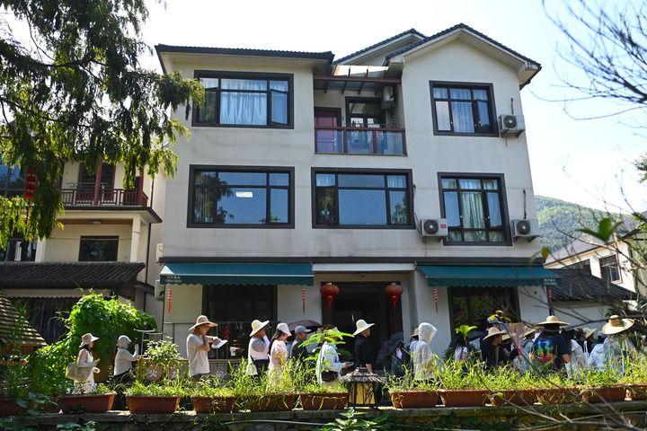 2025年8月5日,在浙江省杭州市余杭區徑山村,游客經過一家低碳民宿。新華社記者 毛竹 攝
